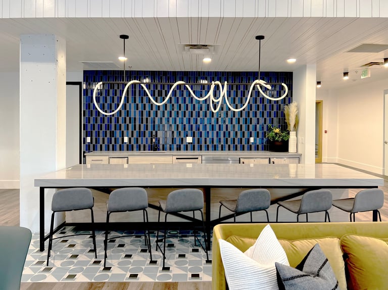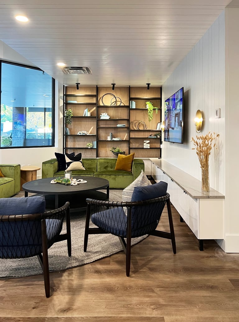 This project was a repositioning of the Sail House Apartments in Kirkland, WA. For the Lobby & Clubhouse, we were inspired by the close proximity to lake Washington and summer boating. Open space, combined with plenty of seating makes this an ideal place for a community gathering.